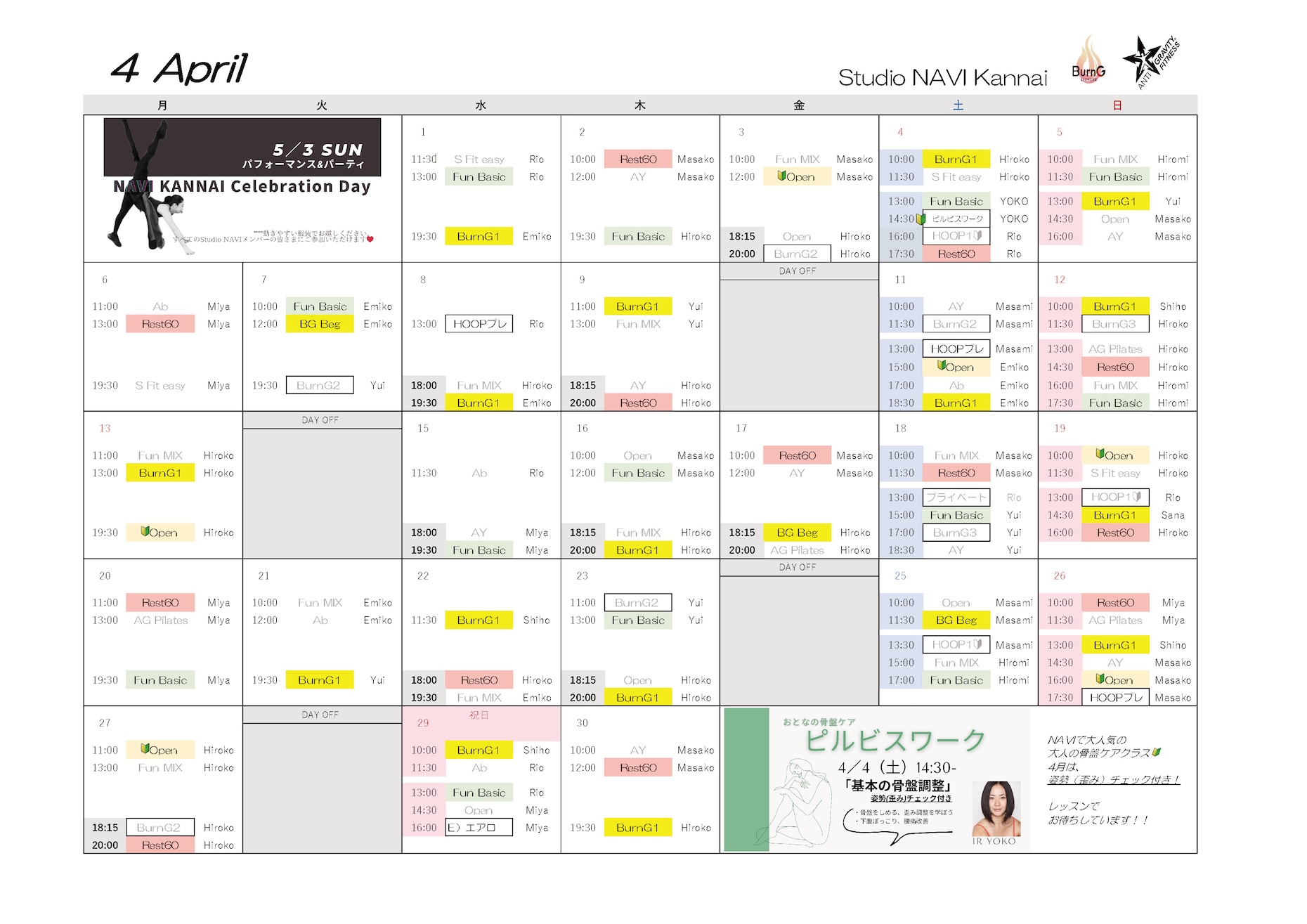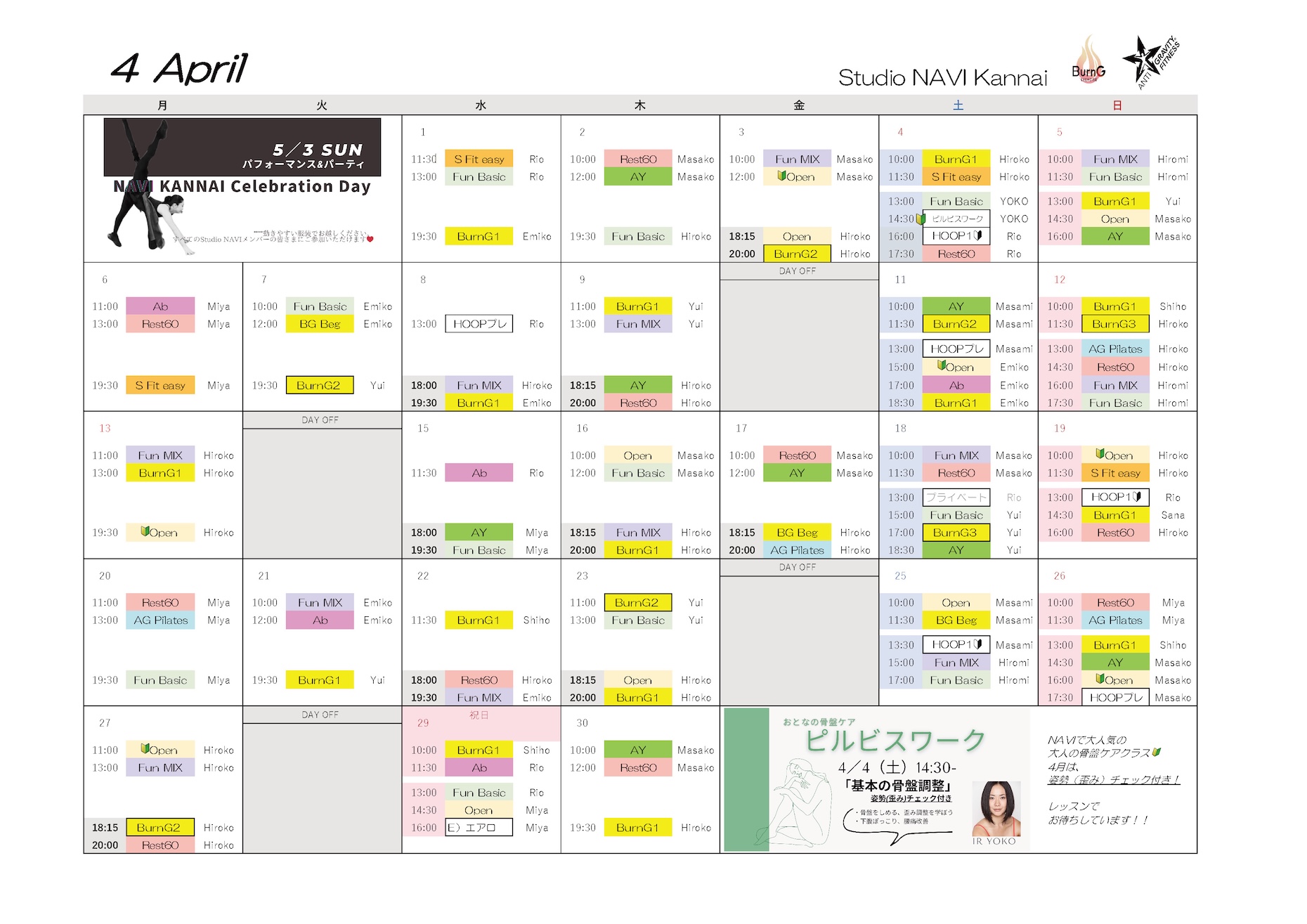 - 皆様にいろいろなクラスを受講いただくために、毎月変えています。20日前後に翌月のスケジュールを店頭、HP、SNSでお知らせしています。