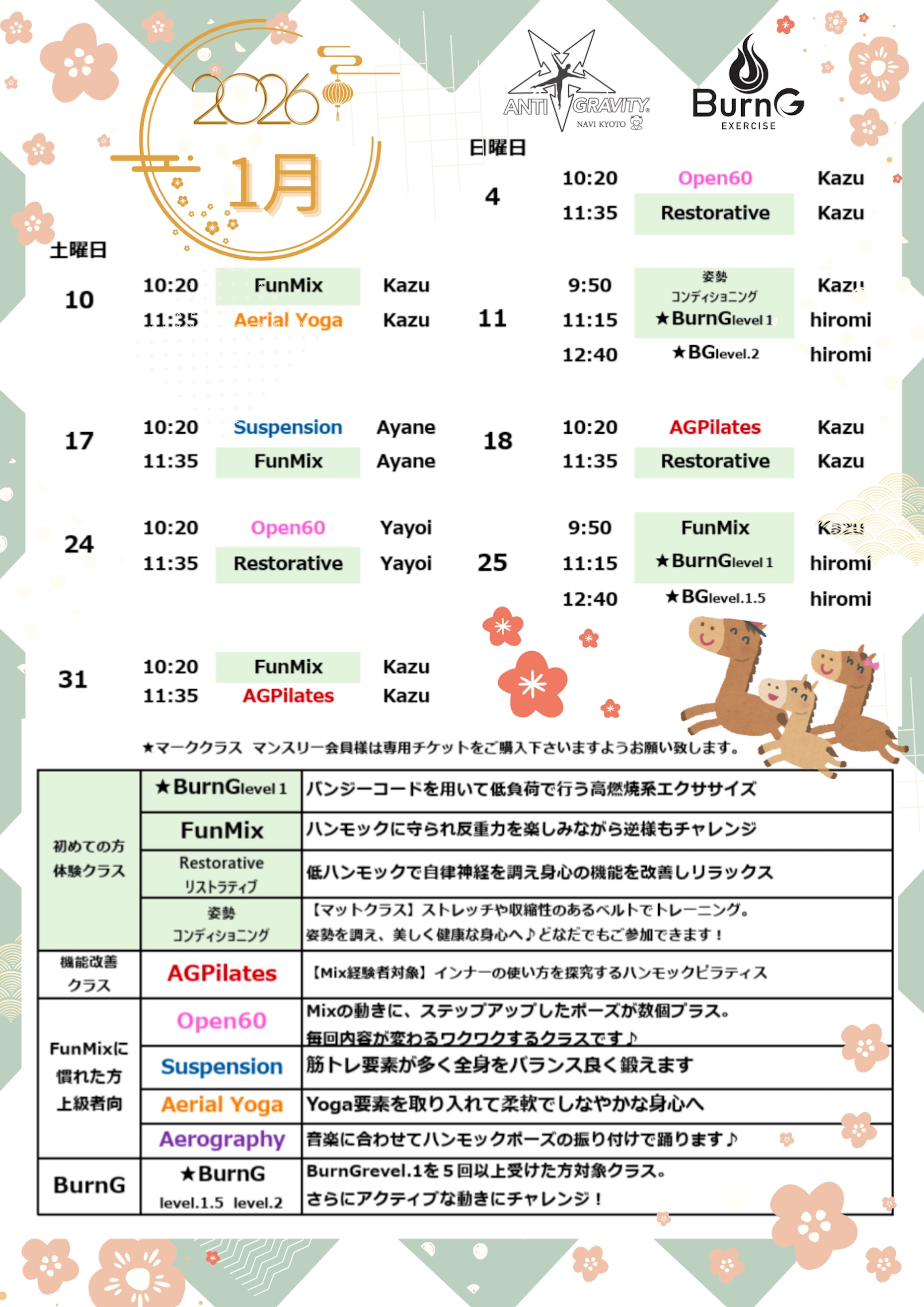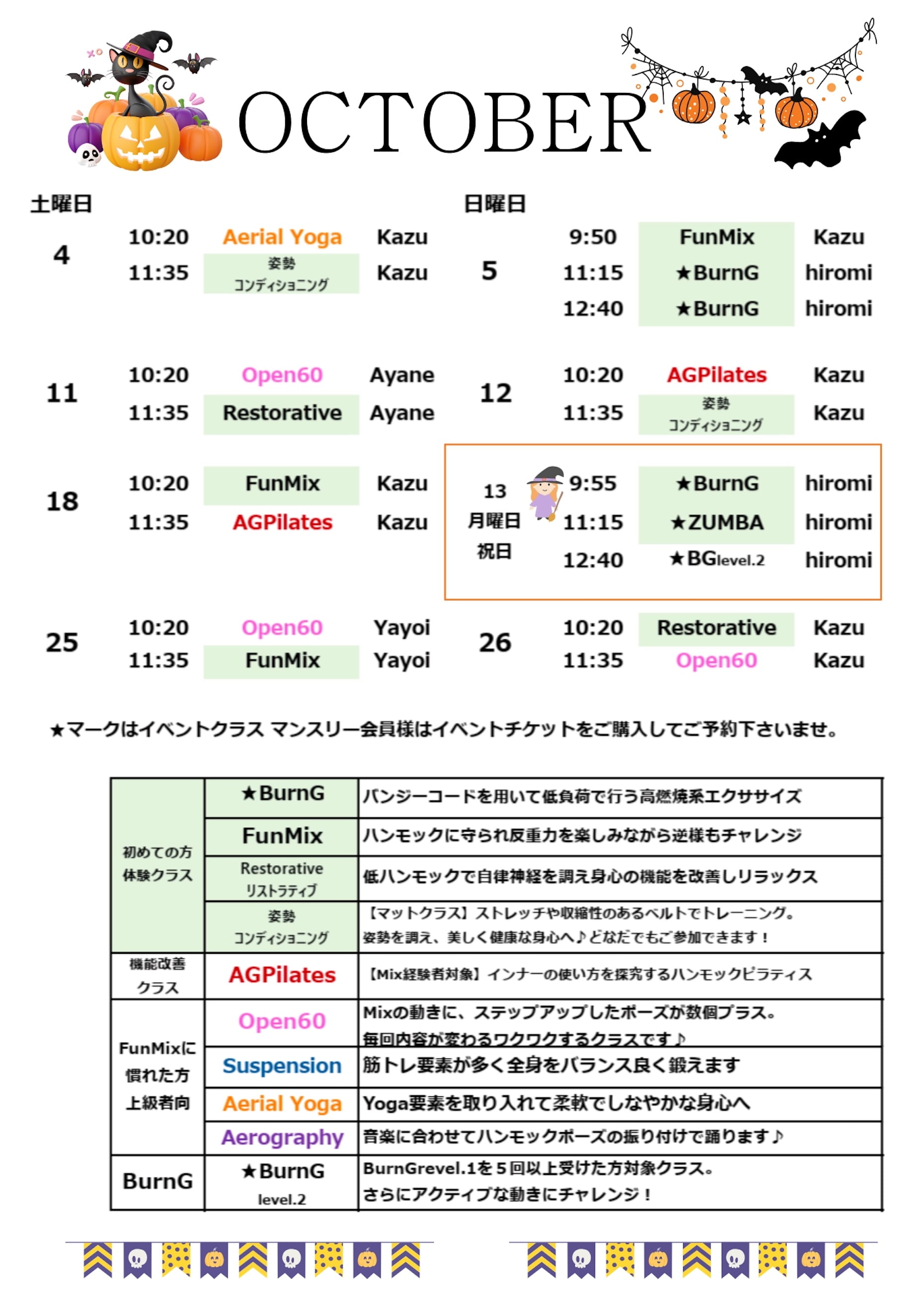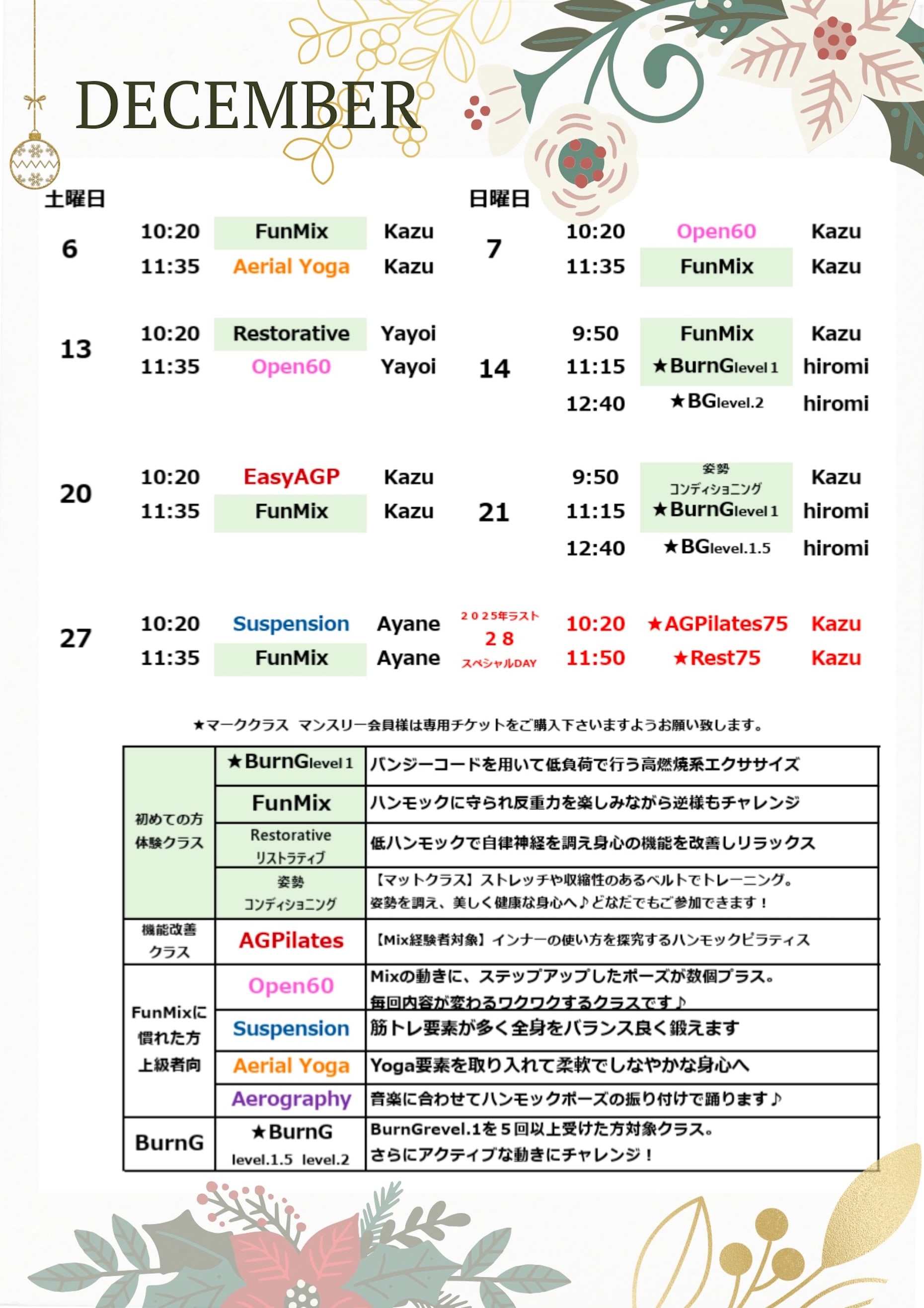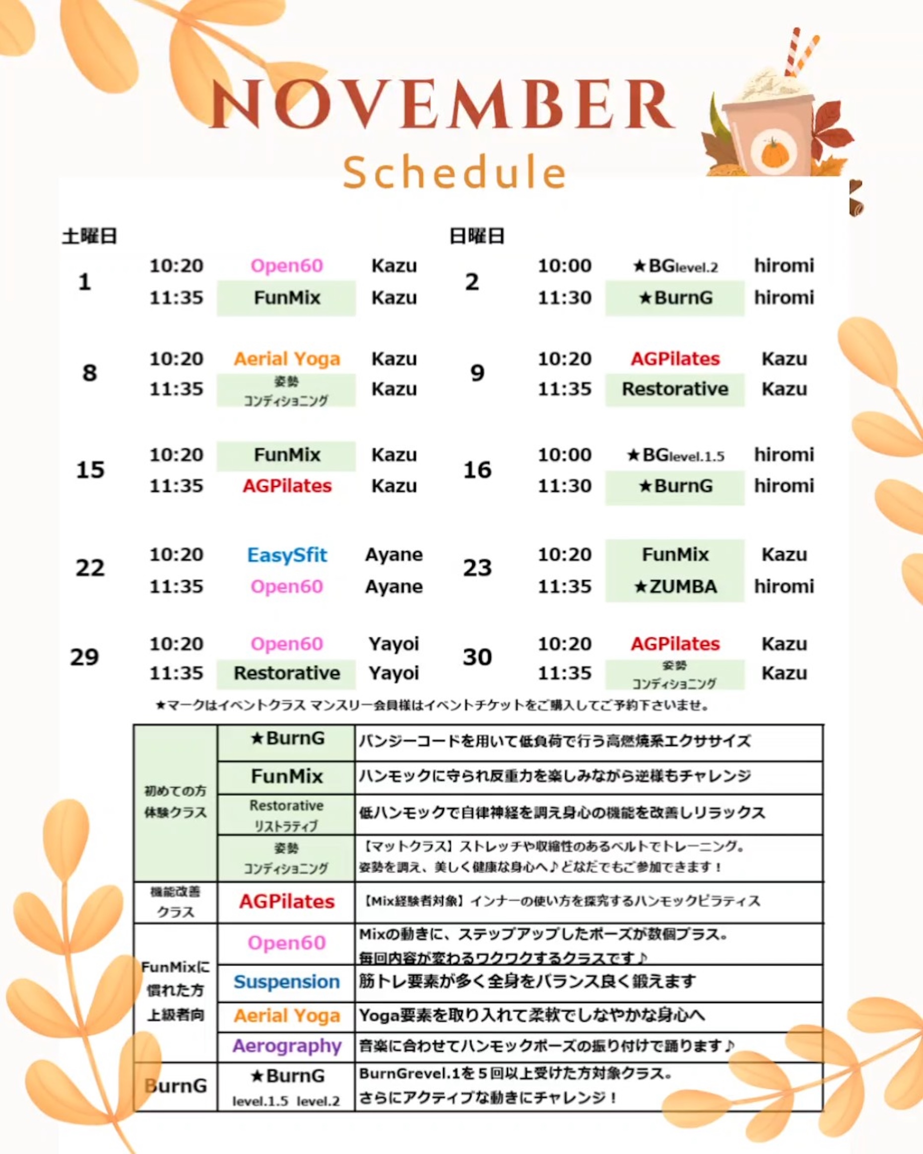 - 皆様にいろいろなクラスを受講いただくために、毎月変えています。20日前後に翌月のスケジュールを店頭、HP、SNSでお知らせしています。