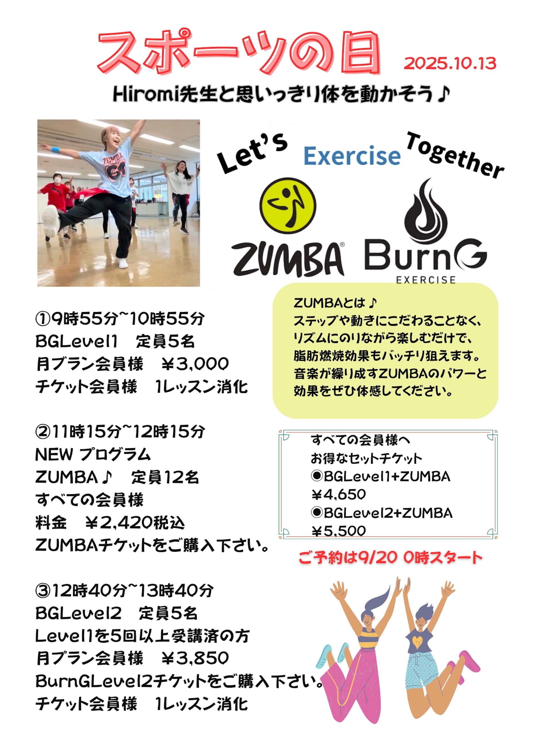 - 運動着( Tシャツorタンクトップ) ブラトップ(スポーツブラ) パンツ(長すぎたり、タボっとしすぎていないパンツ、ショートパンツNG) 室内用運動靴、タオル、お飲み物をお持ちください。